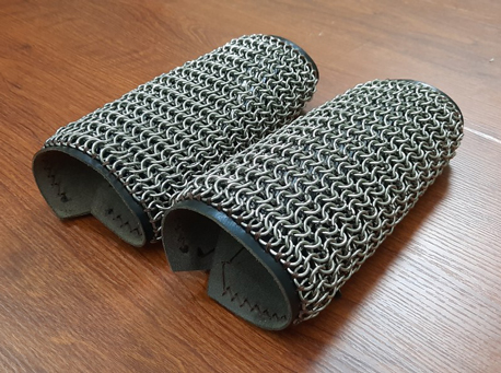 เกราะป้องกันมือได้รับการออกแบบอย่างแน่นหนาและประกอบด้วย 2 ส่วน: เกราะตาข่ายสแตนเลสส่วนบนป้องกันการแทงและการฟันได้อย่างแน่นอน ส่วนล่างเป็นหนังวัวที่แข็งและมั่นคงซึ่งช่วยดูดซับเหงื่อ ตาข่ายสแตนเลสและหนังวัวเชื่อมเข้าด้วยกันด้วยการเย็บด้วยมือด้วยด้ายขี้ผึ้งเพื่อเพิ่มความทนทานของเกราะ