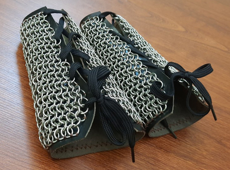 手部防护甲设计坚固,由两部分组成:上部不锈钢网甲绝对防刺防砍,下部是一块坚硬、结实的牛皮,有助于吸汗,不锈钢网和牛皮通过蜡线手工缝合在一起,以增加盔甲的耐用性。